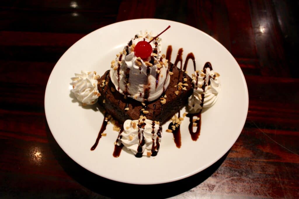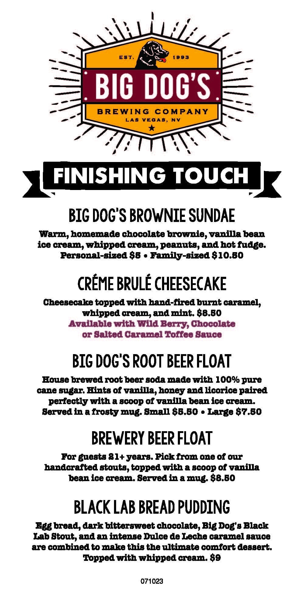 Egg bread, dark bittersweet chocolate, Big Dog’s Lab Stout, and an intense Dulce de Leche caramel sauce are combined to make this the ultimate comfort dessert. Topped with whipped cream. $9