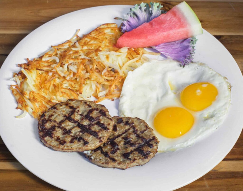 Toasted English muffin, Wisconsin’s Jones dairy farm breakfast sausage, topped with sunny side up eggs, and whole grain mustard cream. Garnished with green onions and served with golden hashbrowns. $15