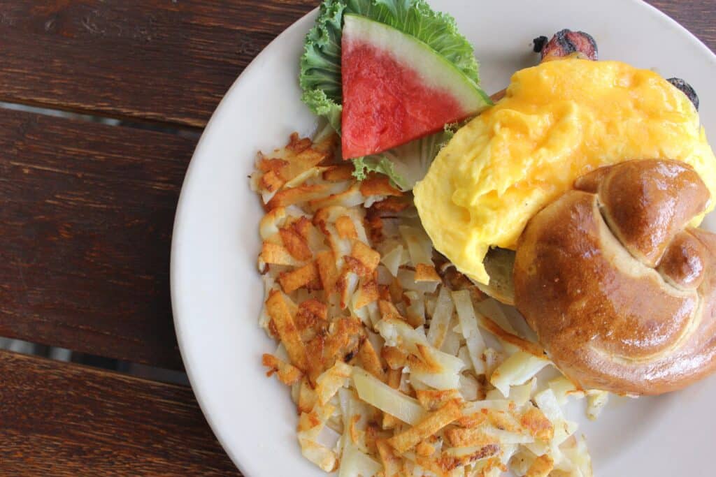 Pretzel roll with a grilled butterflied Burnt-Ends Smoked Brat, scrambled eggs and choice of cheese. Served with Home fries or Hash Browns. $16.25