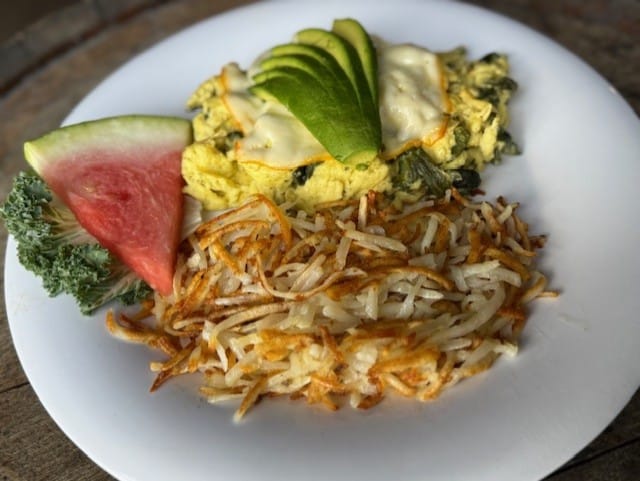 Two eggs scrambled with Big Dog’s tender pot roast, poblano peppers and Pepper Jack cheese. Served with sliced avocado. $18.25