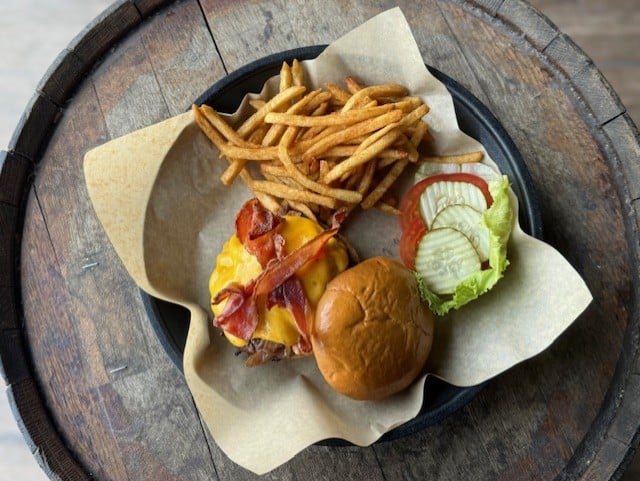 Angus chuck burger, Burnt-Ends Smoked Brat, applewood smoked bacon, lettuce, tomato, Cheddar & Swiss cheese, dill pickle chips & onion rings on a pretzel bun. $21